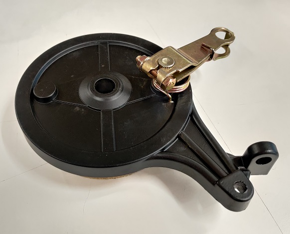 Takajarrukilpi, sisältäen kilven lisäksi jarrun käyttövivun sekä jarrukengät kasattuna kokonaisuutena