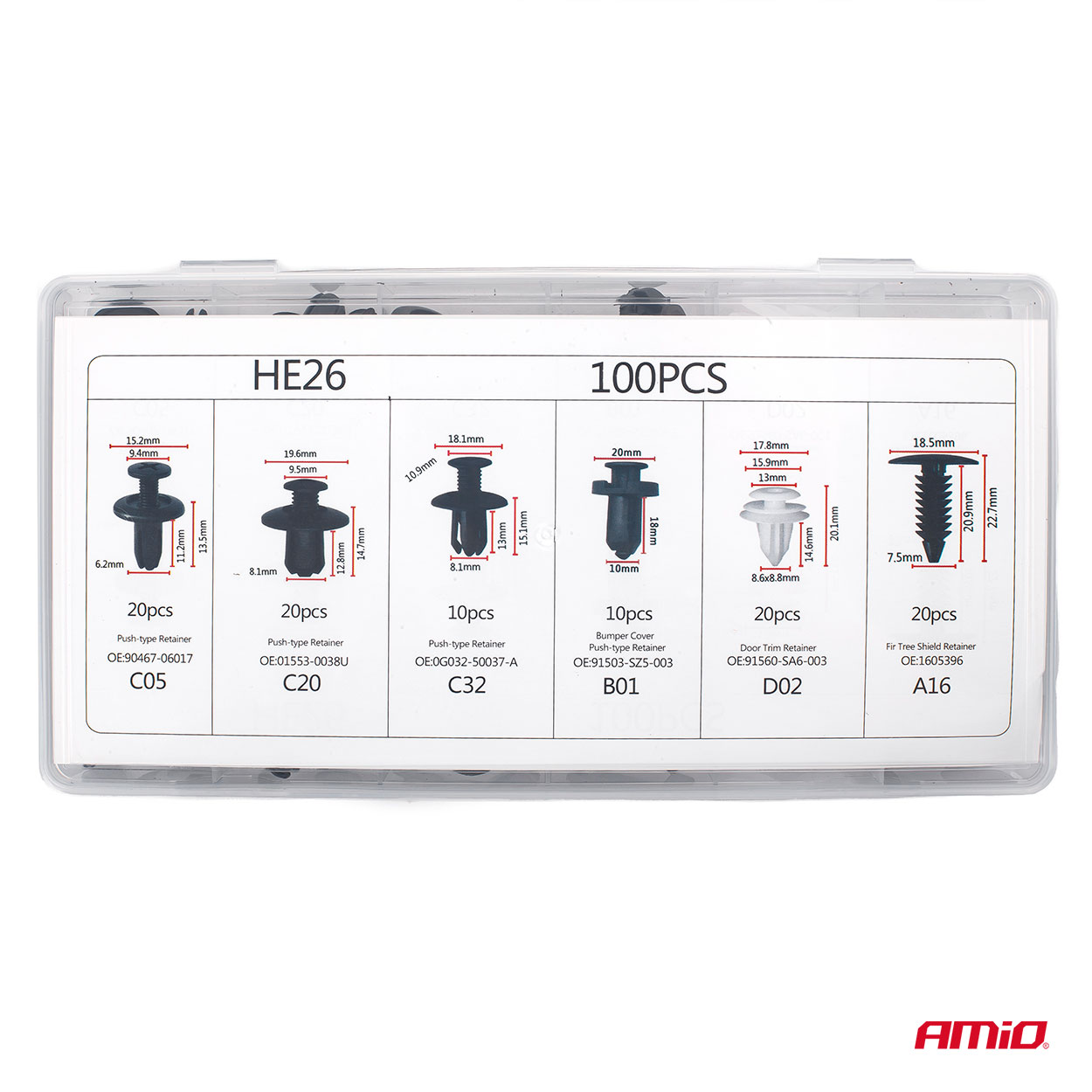Universaali sarja, jossa on 100 kappaletta erilaisia pidikkeitä, tappeja ja auton kiinnikkeitä verhoilun kiinnittämiseen autoon, lokasuojiin, puskuriin, oviin.