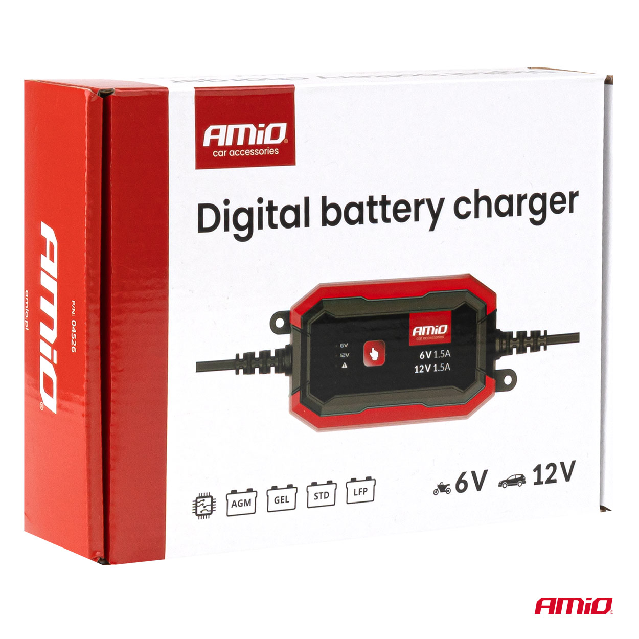Amio-digitaalilaturi on kompakti ja turvallinen laite AGM-, GEL- ja LiFePO4 (LFP) -akkujen lataamiseen. Se soveltuu erinomaisesti autoihin, moottoripyöriin, veneisiin ja pieniin sähkölaitteisiin tarjoten vakaan ja luotettavan 6 V:n tai 12 V:n akkujen nopean latauksen.