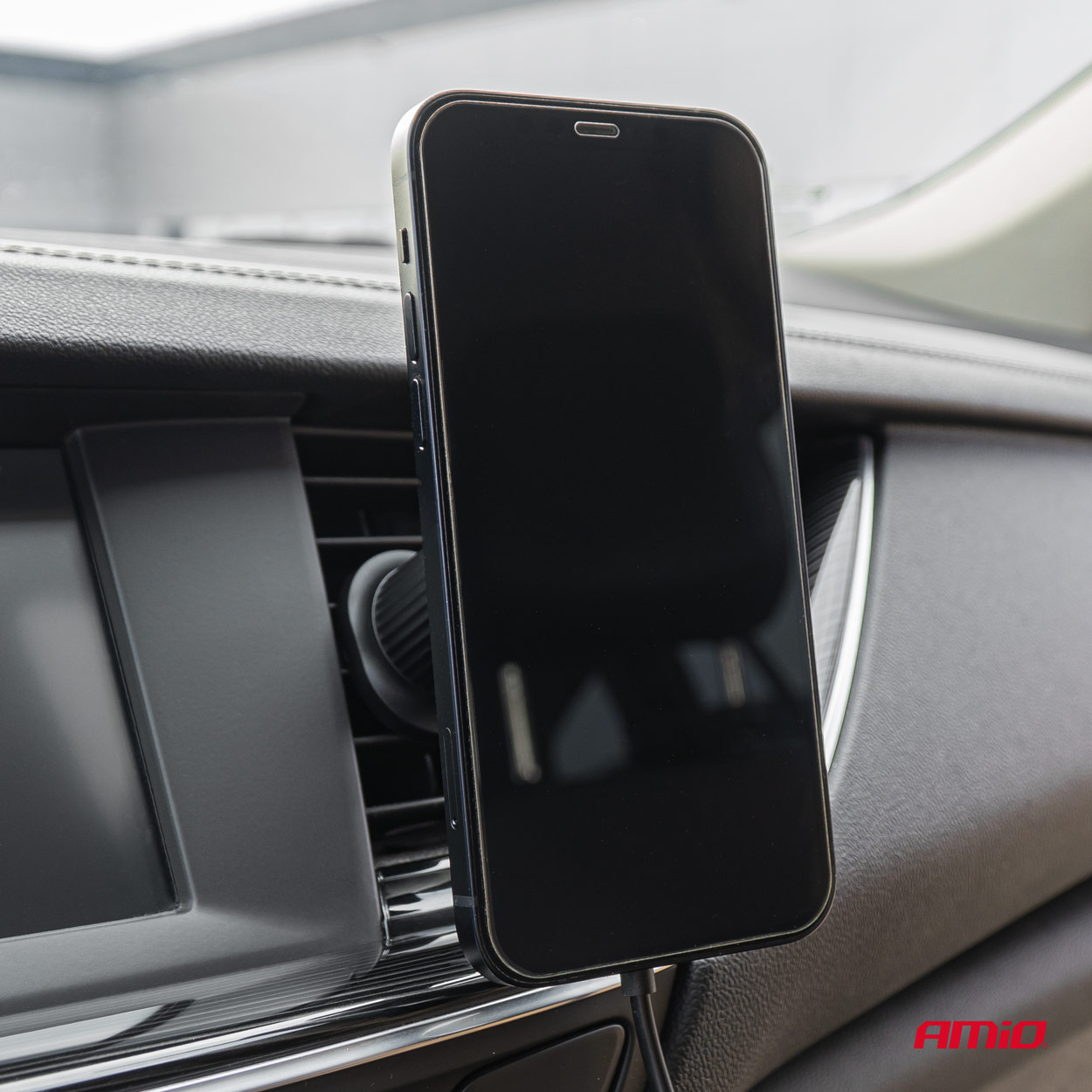 Innovative and elegant mount AMiO My Mag series compatible with MagSafe technology. This advanced holder features a powerful magnet and a swivelable arm for mounting on the car's air vents. It comes with a round metal plate that allows you to use the holder on any phone.