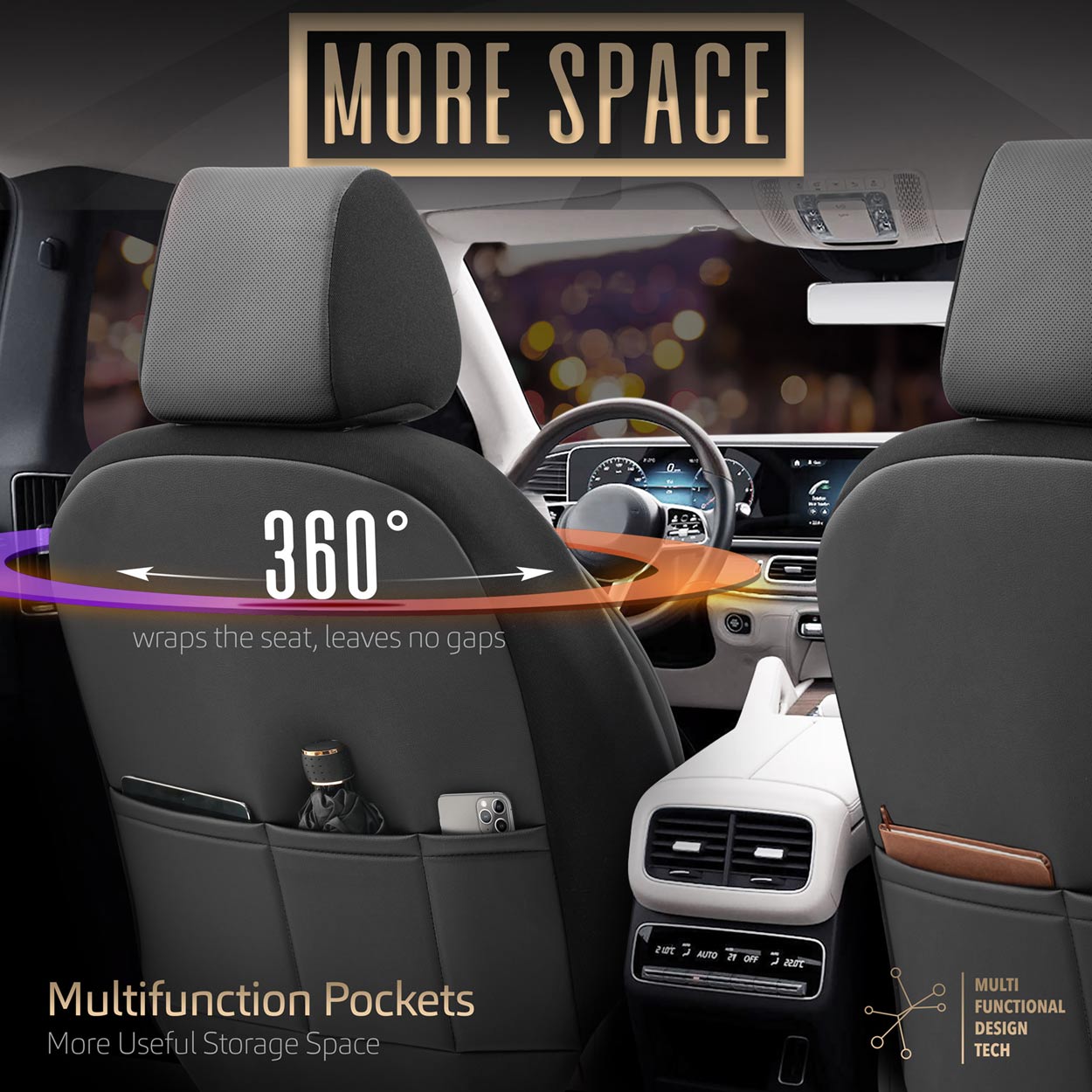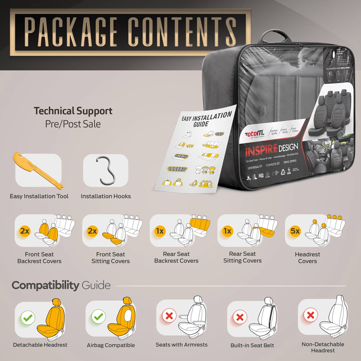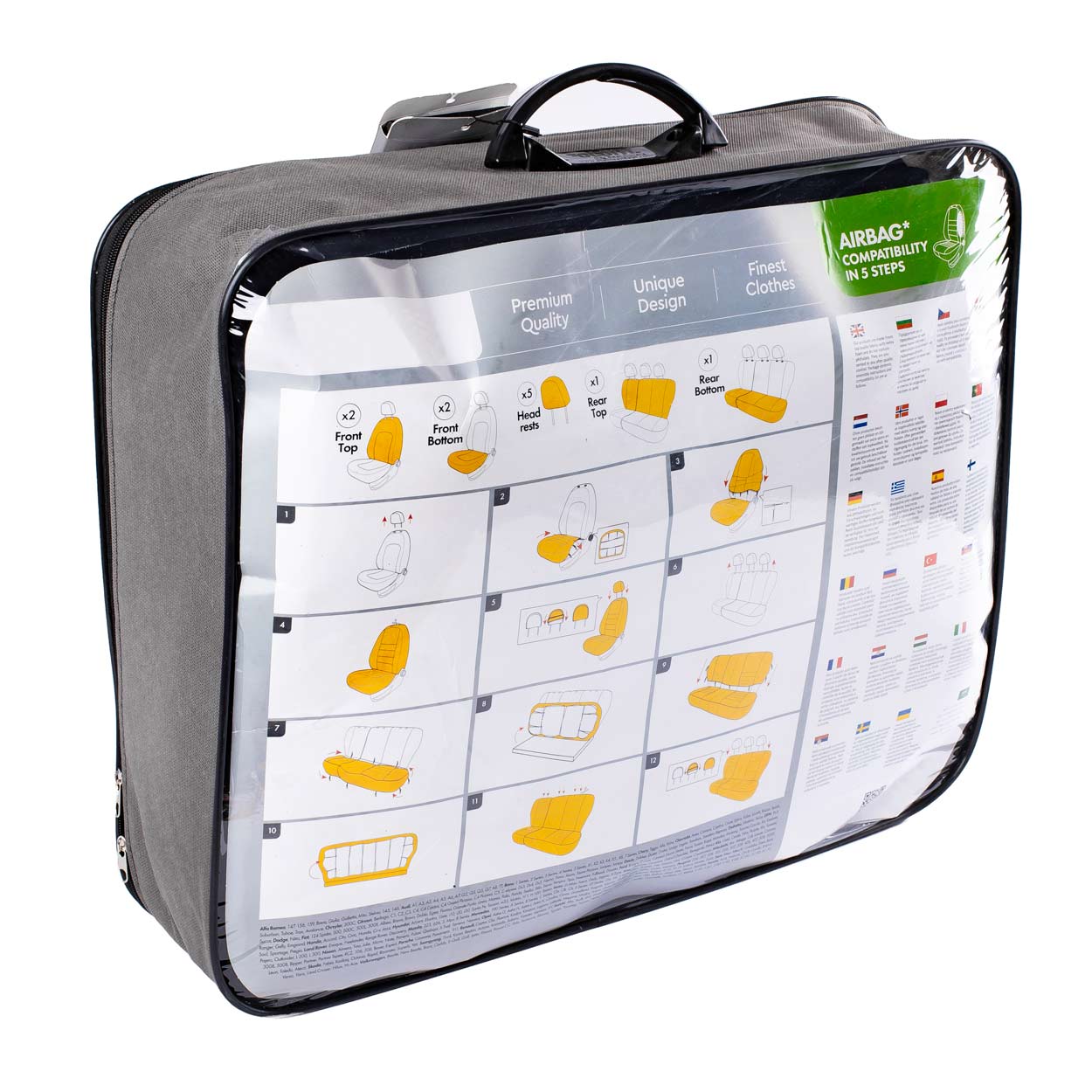 Takapenkillä on jaettava selkänoja, joten päälliset sopivat useimpiin markkinoilla oleviin istuimiin (jakamattomat istuimet sekä oikealle ja vasemmalle jaetut). Selkänojat voidaan helposti taittaa alas tavaratilan suurentamiseksi.