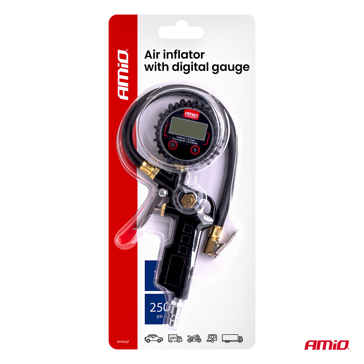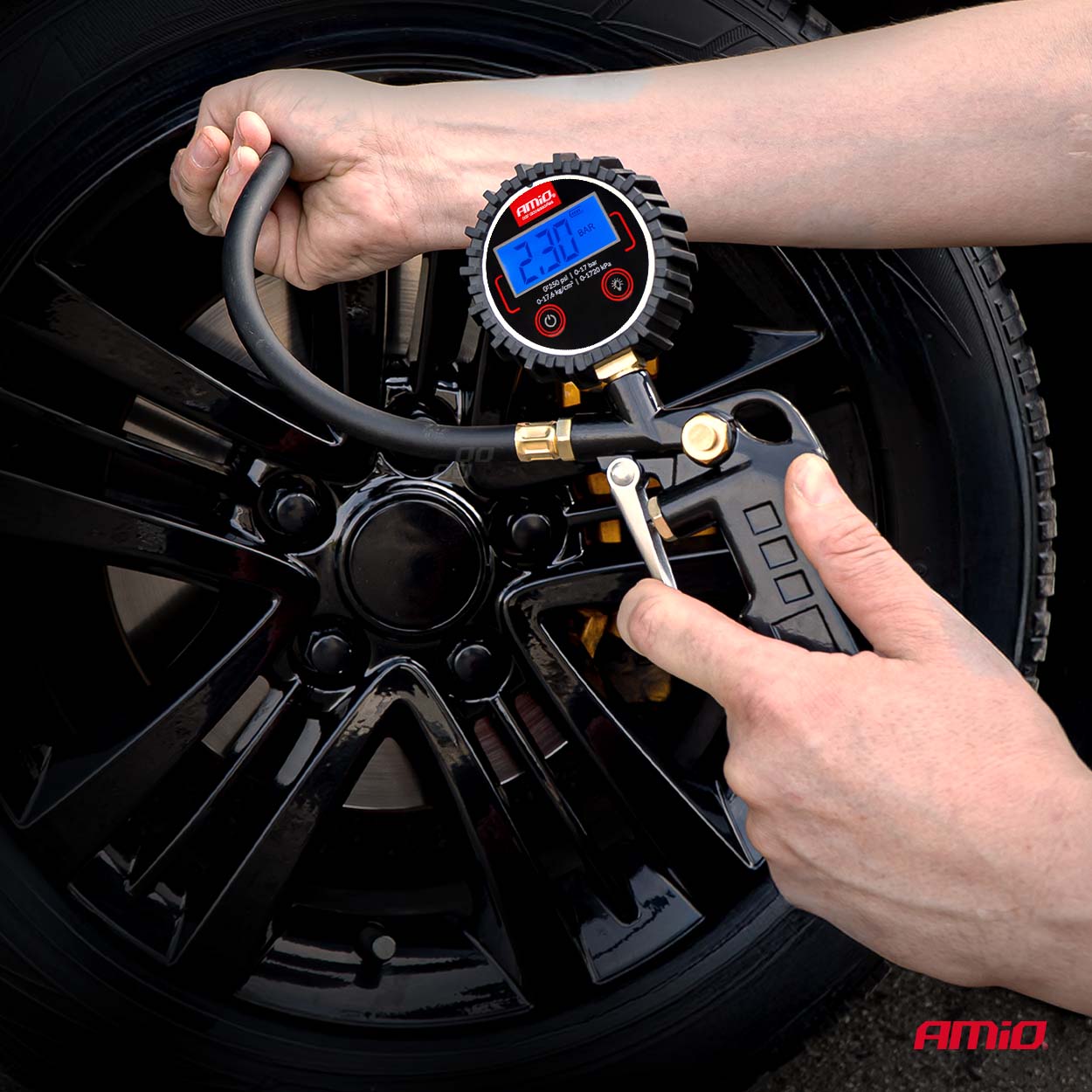 Pistoolilla täytetään renkaita ja tarkistetaan rengaspaineet autoissa, moottoripyörissä, polkupyörissä, skootereissa ja pyörissä.