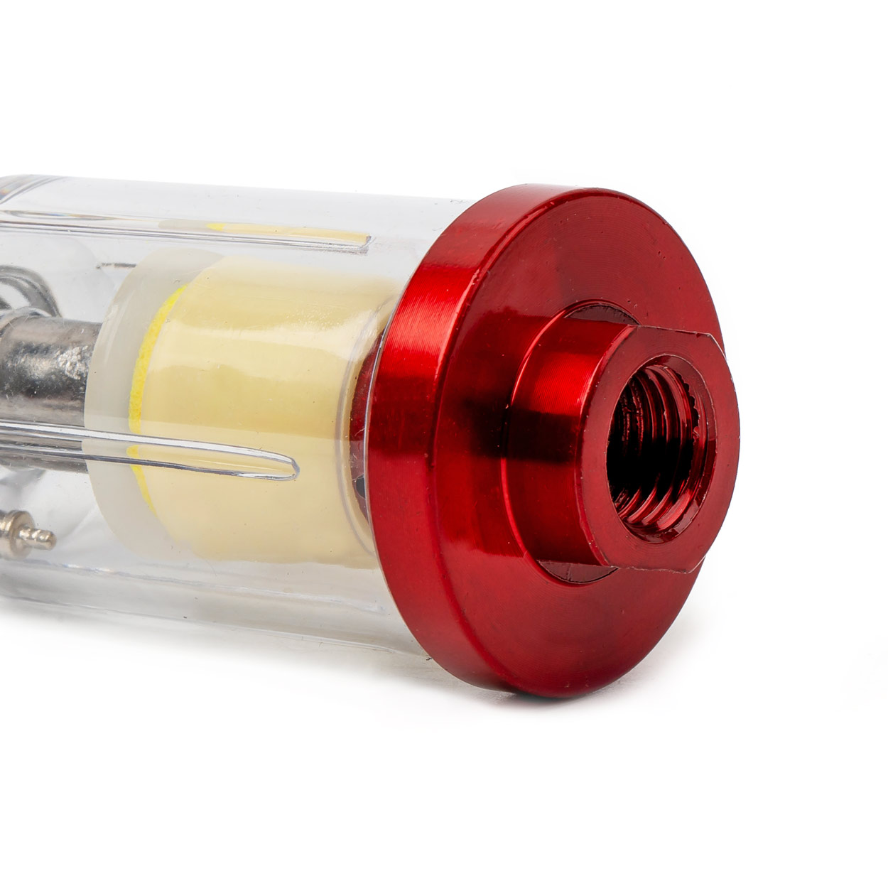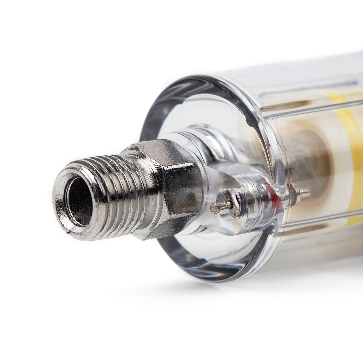 The compressed air separator catches water and oil particles which condense in the pneumatic line. It is designed for use with paint guns, spanners and other pneumatic devices.